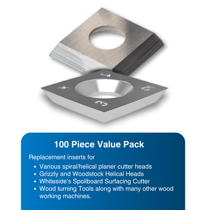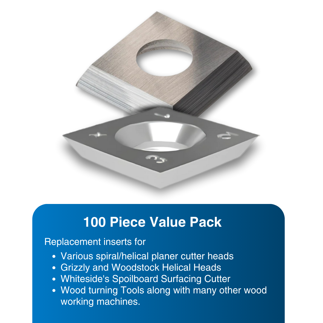 Replacement inserts for various spiral/helical planer cutter heads, Grizzly and Woodstock Helical Heads, Whiteside's Spoilboard Surfacing Cutter, wood turning Tools along with many other wood working machines.