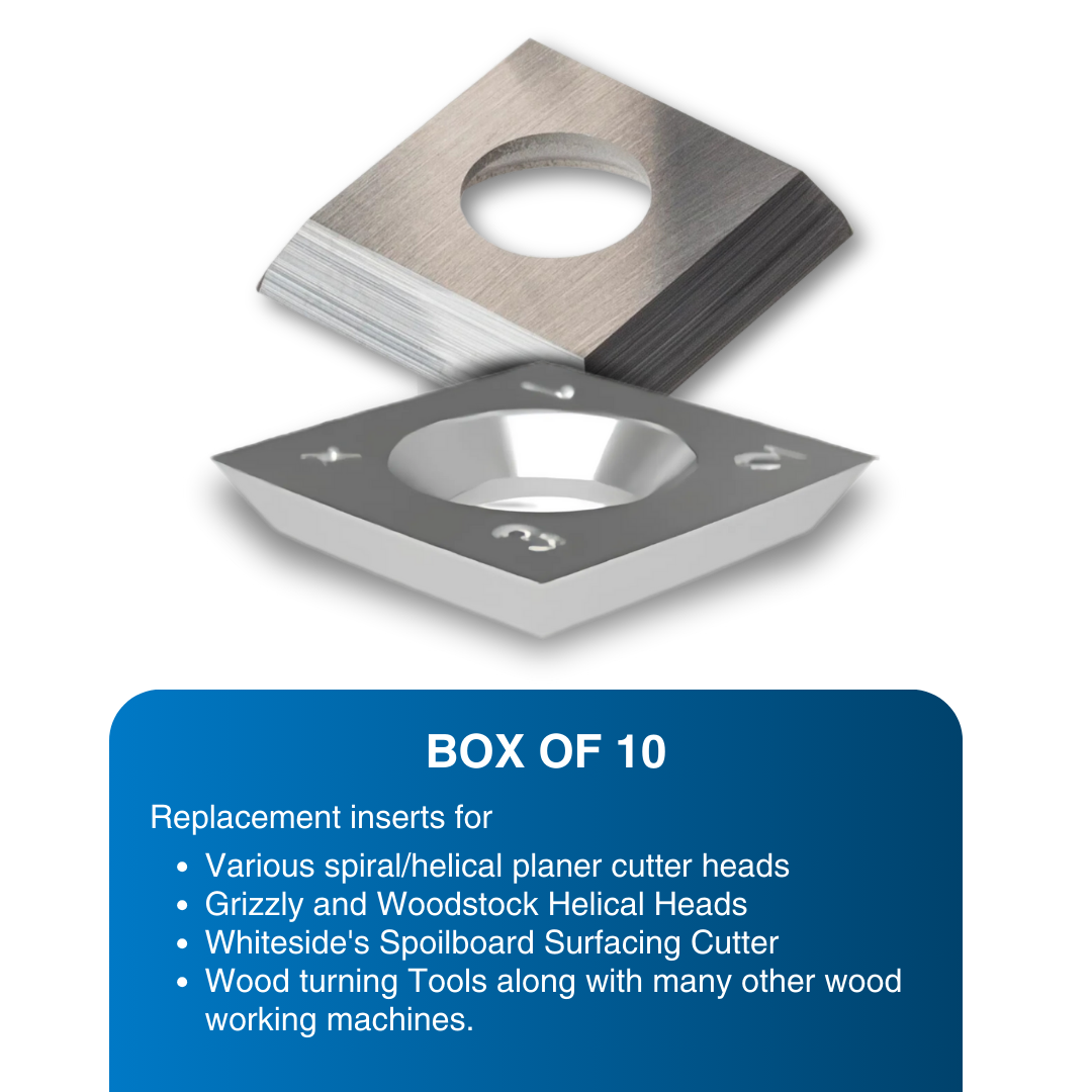 Replacement inserts for various spiral/helical planer cutter heads, Grizzly and Woodstock Helical Heads, Whiteside's Spoilboard Surfacing Cutter, wood turning Tools along with many other wood working machines.